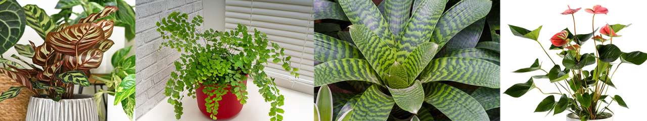 From left to right - calathea, Adiantum (maidenhair fern) Bromeliad and anthurium.