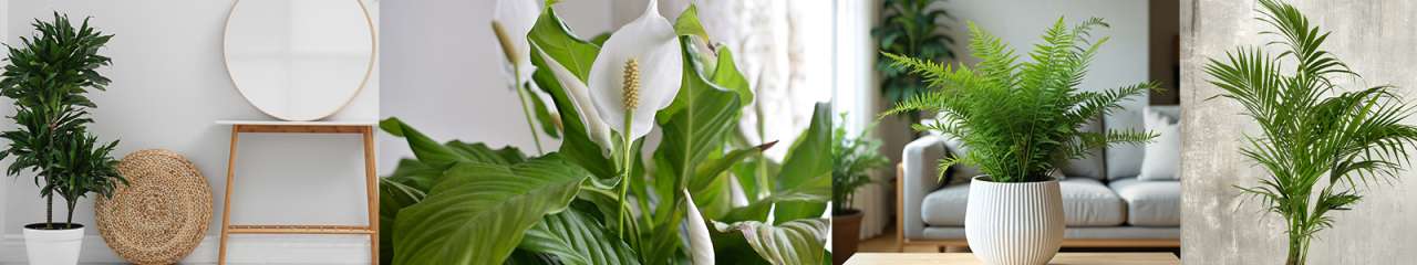 From left to right - Dracaena, Spathiphyllum (Peace Lily) Ferns or Kentia Palm.