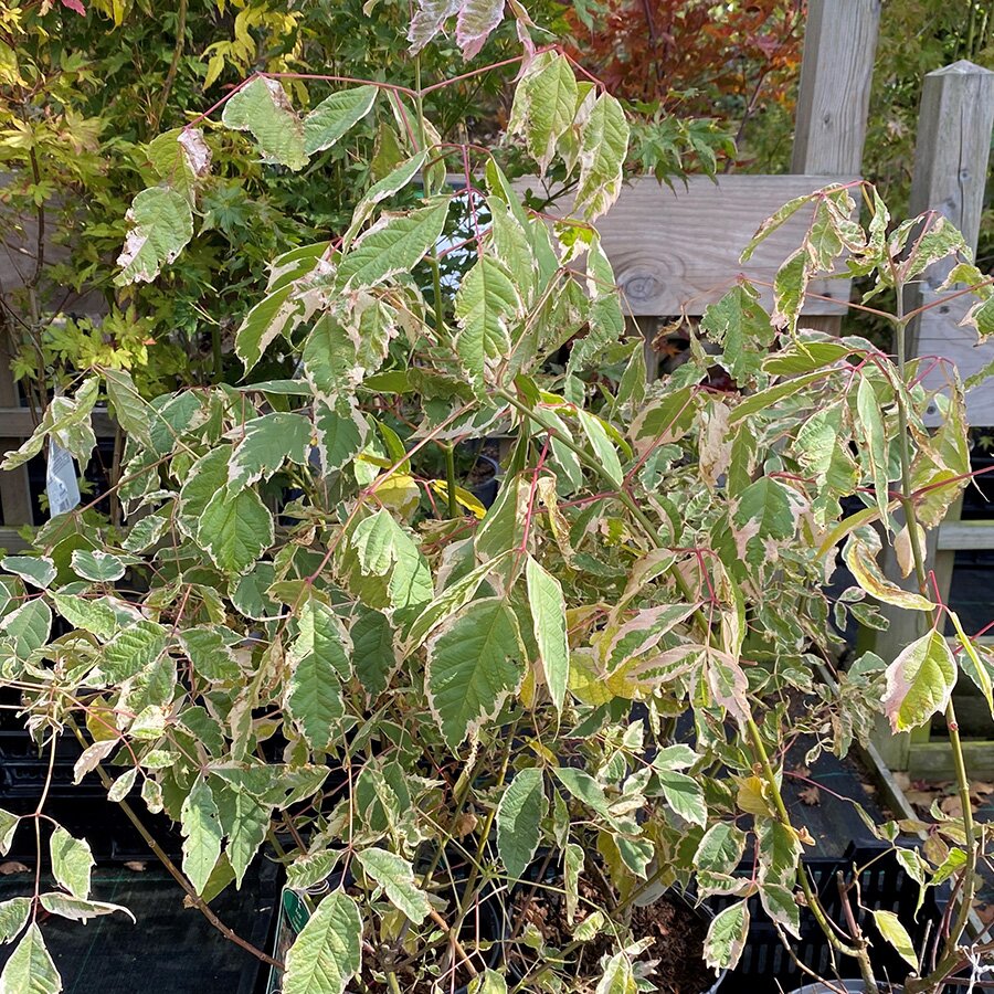 A vigorous deciduous tree with foliage that starts as red leaf stems which produce pinnate green leaves with a broad pink margin and green/yellow flowers