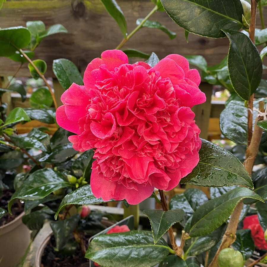 Handsome evergreen shrub with large, ruffled, peony-shaped pink blooms
