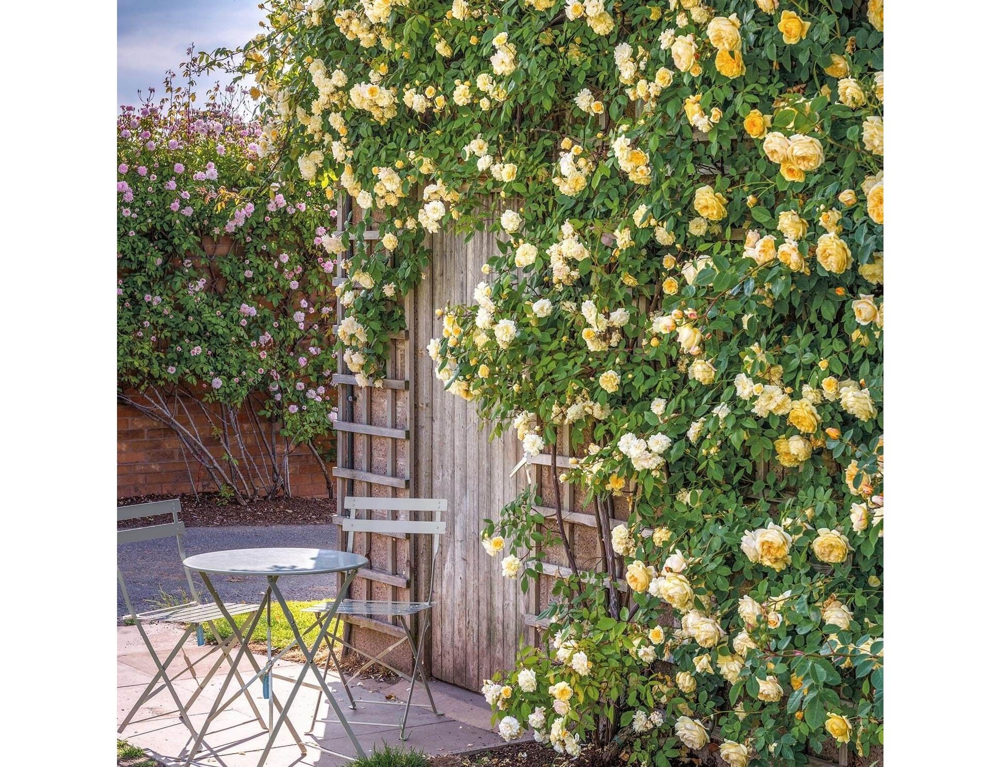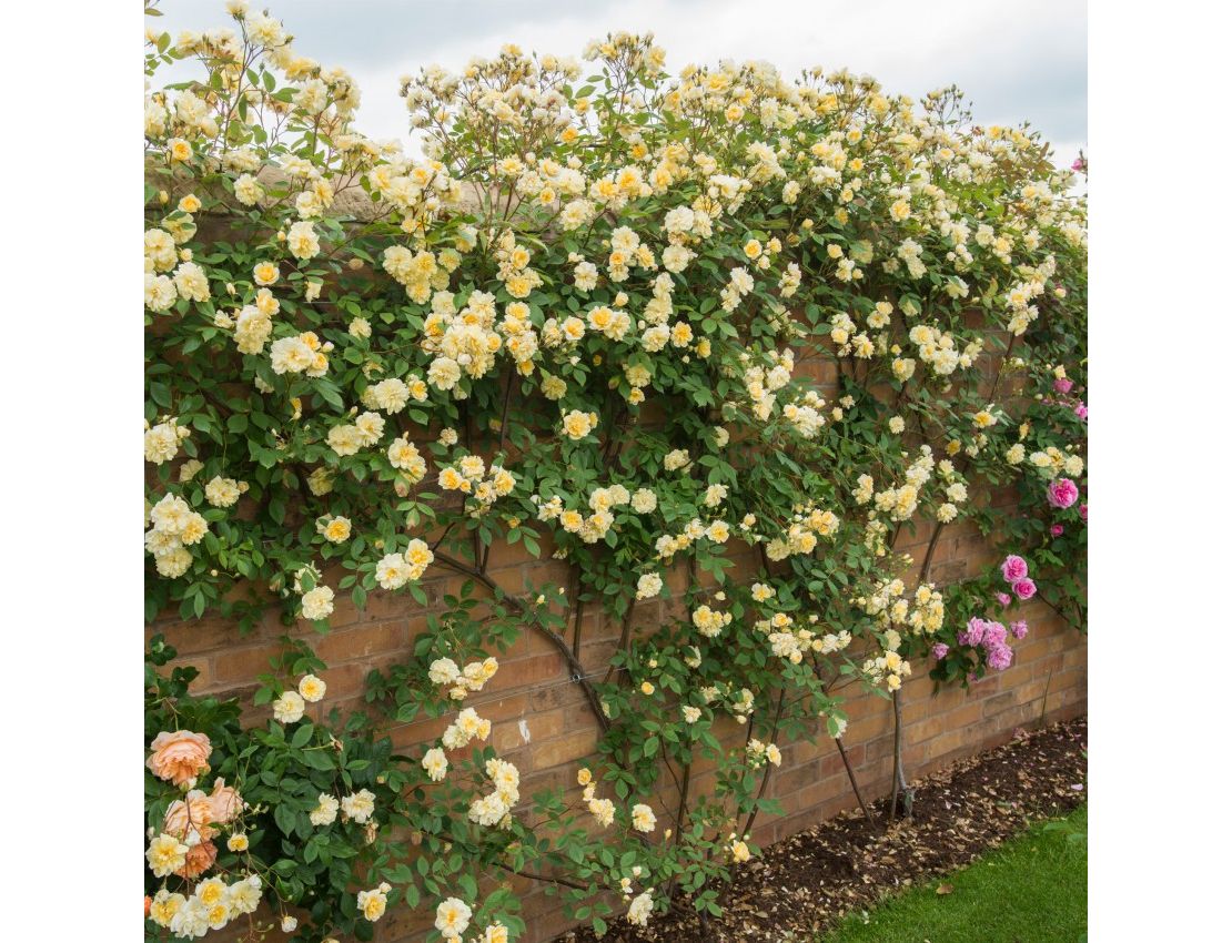 Clusters of pretty, soft yellow blooms with a medium musky fragrance are borne on this outstanding rambler