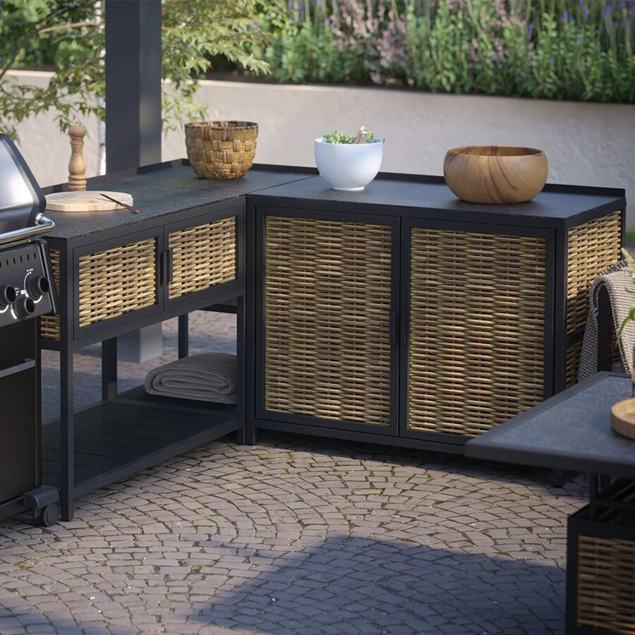 This versatile outdoor kitchen cabinet is a core component of the Langley modular collection, offering extensive storage for your garden culinary setup. Constructed with a robust black matt powder-coated aluminium frame, it is elegantly wrapped in a 10mm decorative outdoor raffia weave for a modern, textured look. The work surface is finished with high-quality, outdoor-grade ceramic in a dark grey colour, providing a sophisticated and durable area for food preparation.