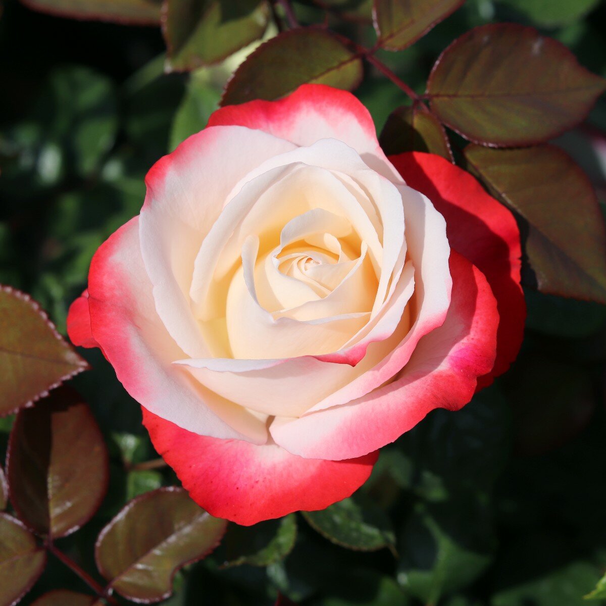 Cottage garden rose with large old fashioned shaped flowers with an exquisite colour of creamy white with cherry red edges.