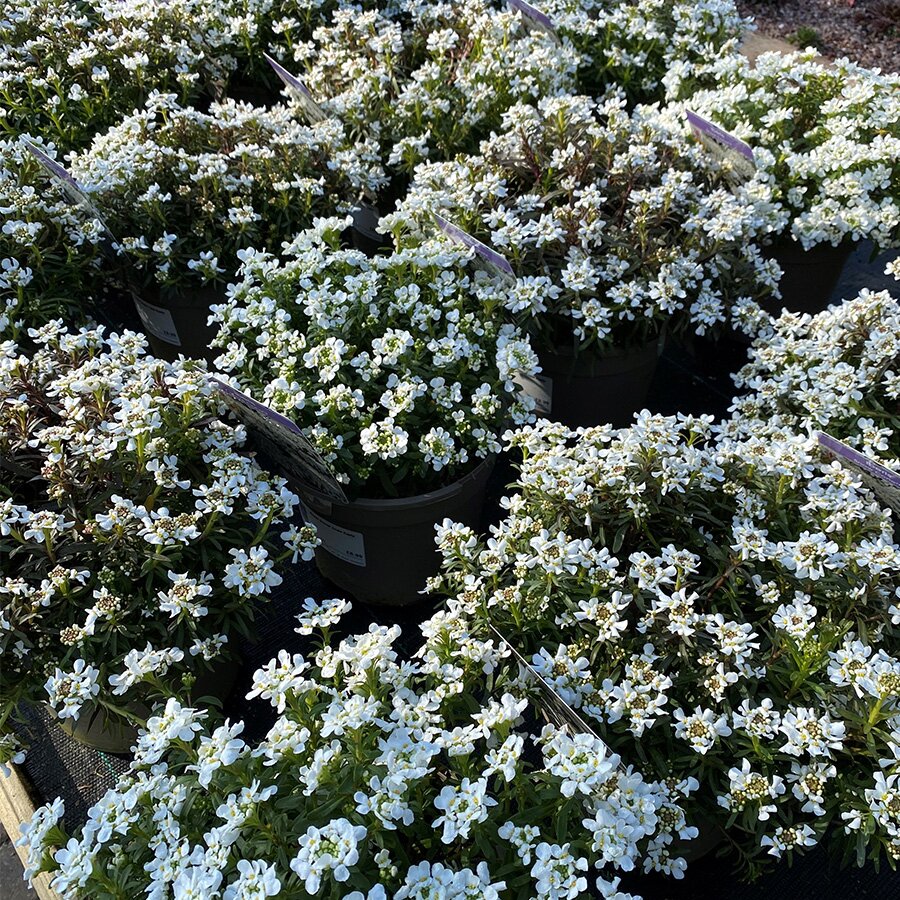 Popular rock garden plant with evergreen foliage and a blizzard of larger than average white flowers through the spring