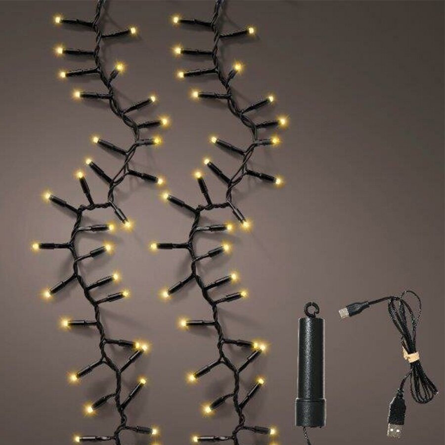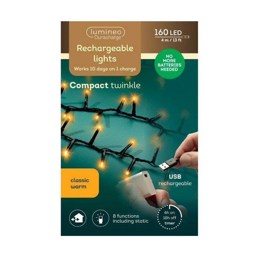 160 LED duracharge compact lights with 8 function twinkle effect suitable for outdoor use, reacharge via usb cable included.