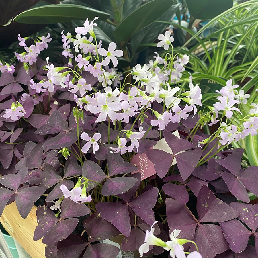 Dramatic, three-lobed leaves (hence the name Shamrock) in deep purple with lighter pink/purple markings that open and close according to light levels